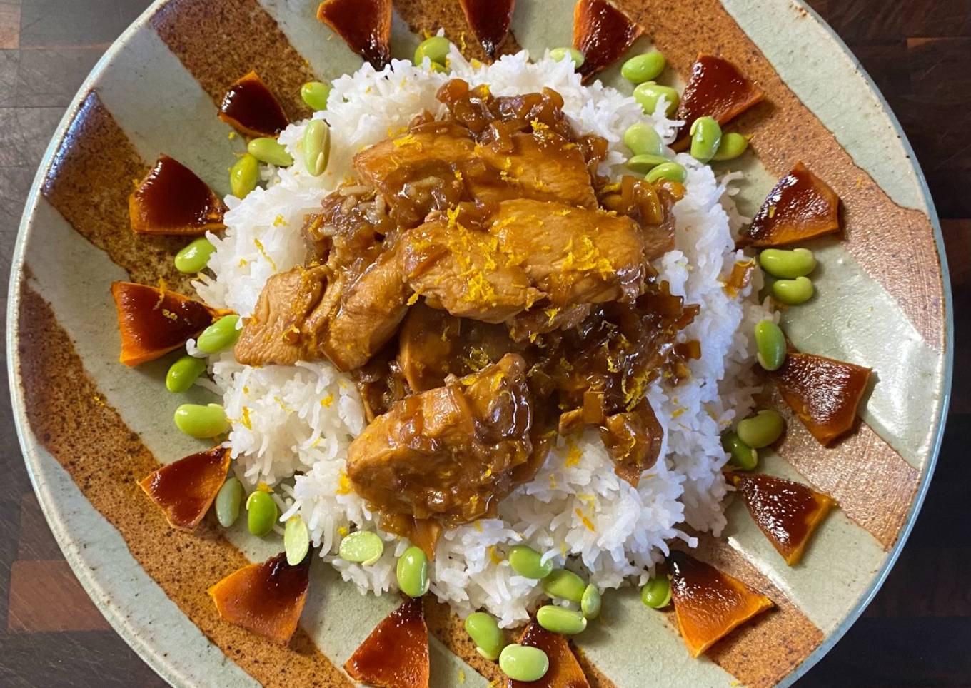 Poulet et Butternut teriyaki, agrumes, riz et edamames