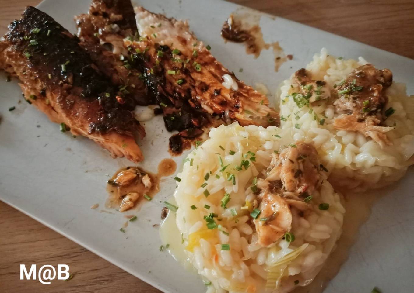 - Une fois la cuisson du risotto terminé, découper votre poisson en filets et servir à l'assiette avec le risotto. Saupoudrer d'un peu de ciboulette ciselée.