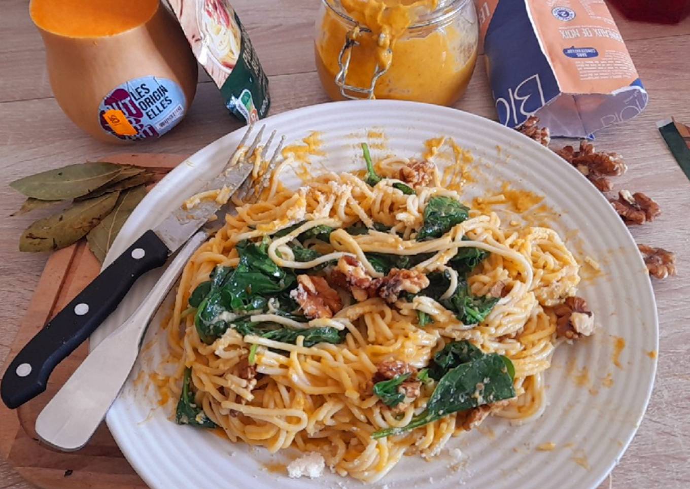 - Essorer vos pâtes et ajouter de la crème de butternut dessus, les épinards cuits, parsemer de parmesan et de noix