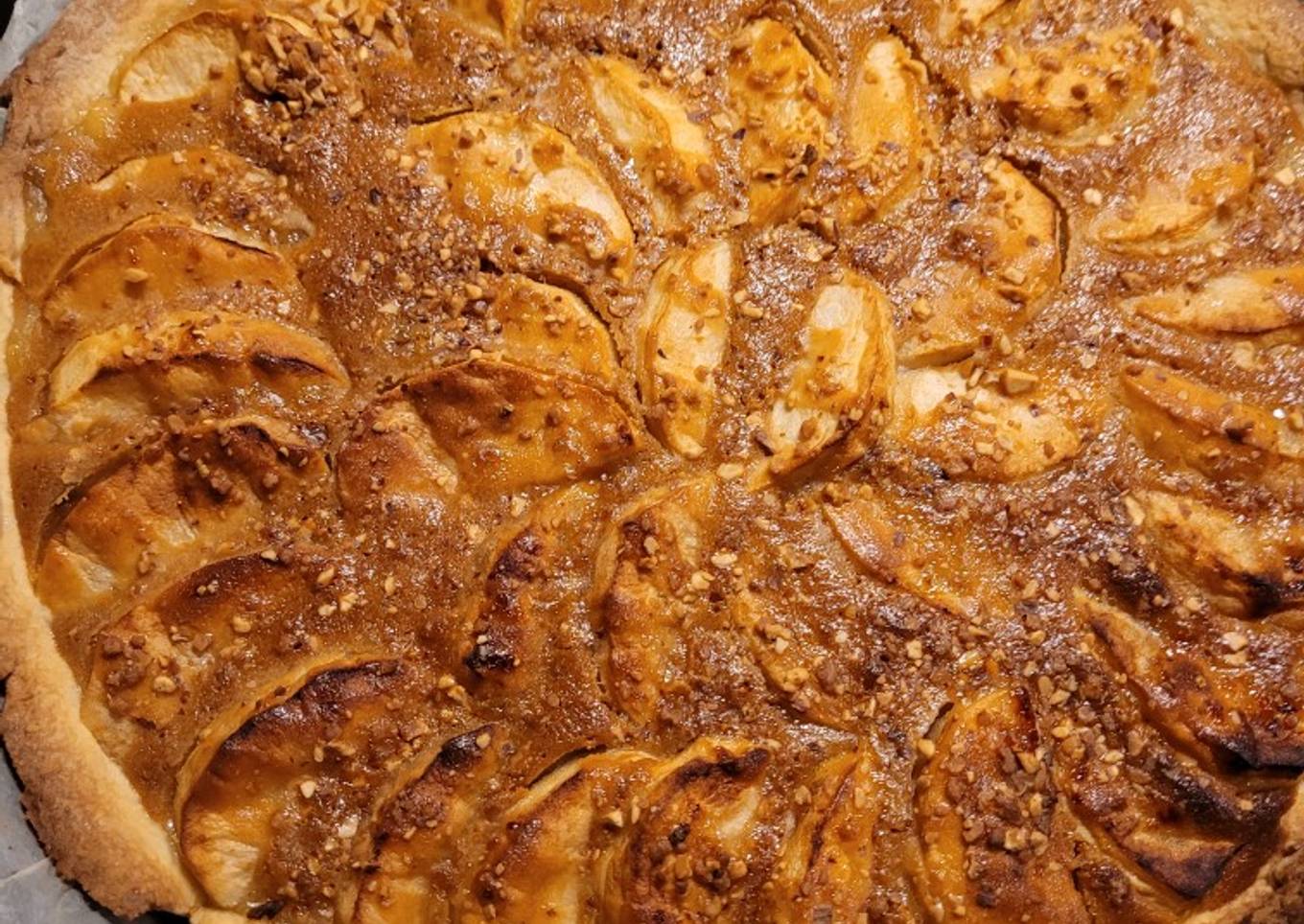 - Repartir la compote froide sur le fond de tarte et y déposer les quartiers de pomme.