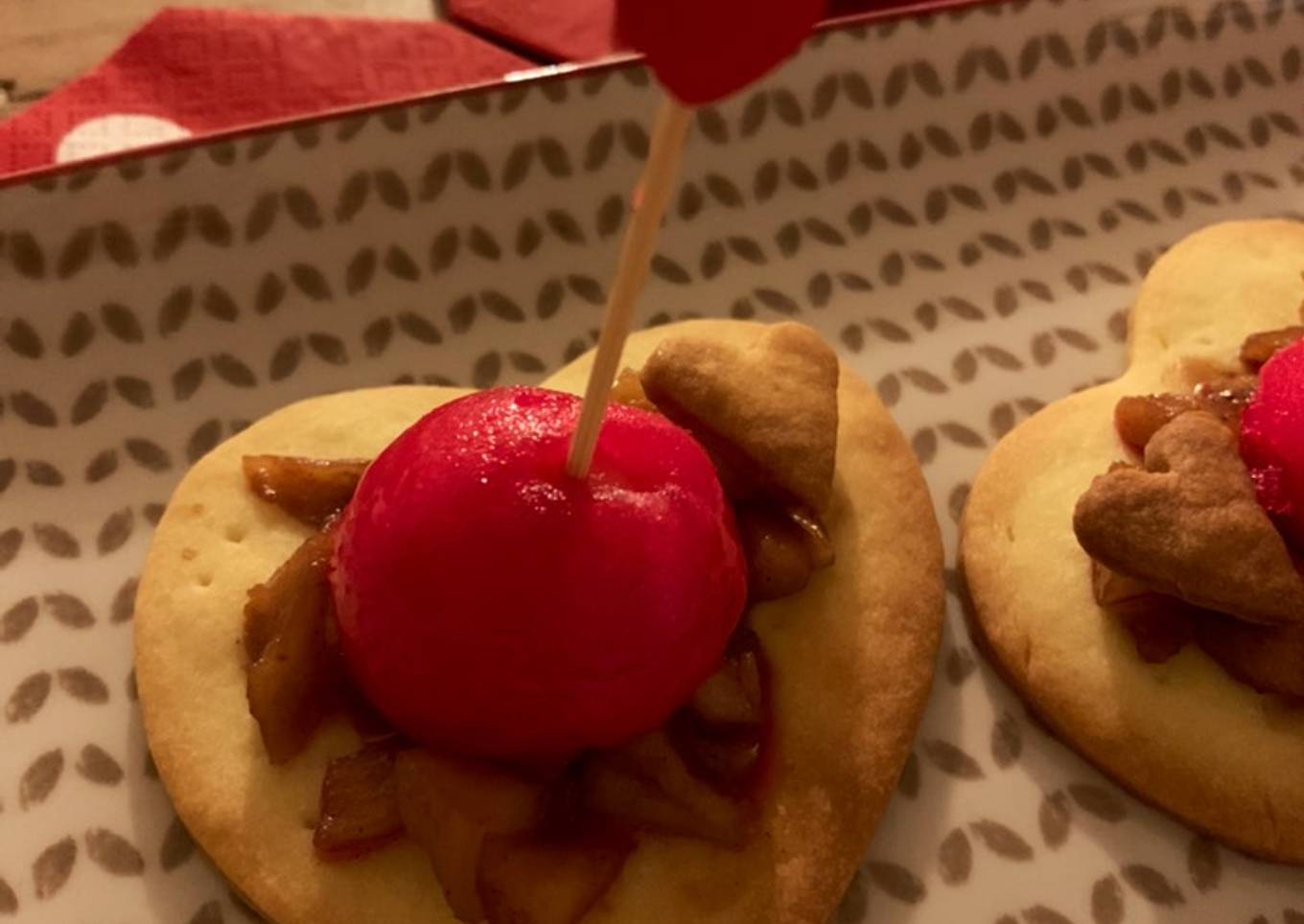 Déposer la garniture de pommes au cidre sur les sablés, ajouter une pomme d'amour - Servir avec de la crème fraîche épaisse, de la glace vanille, un sorbet aux pommes ou de la Chantilly.