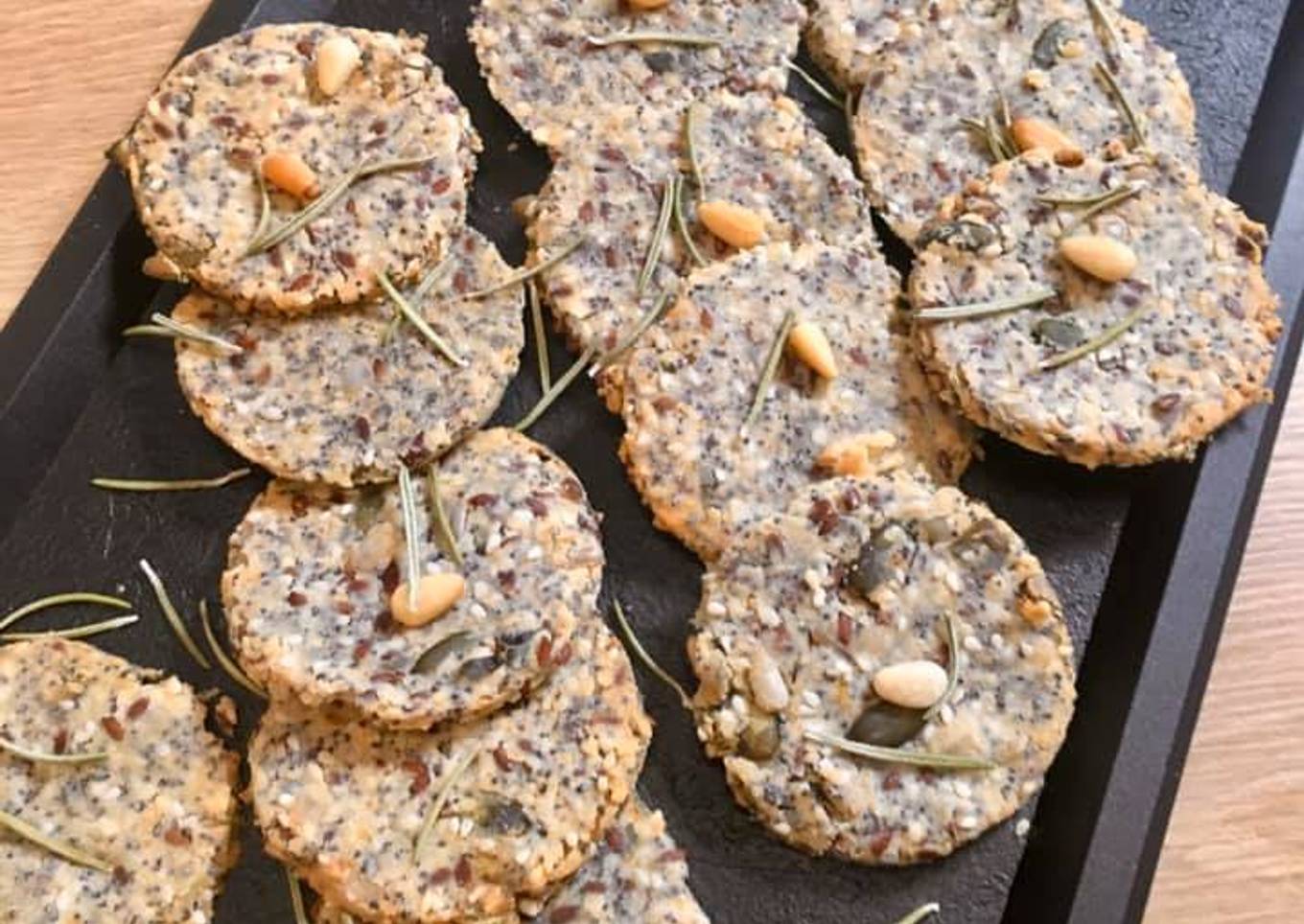 - Décorez chaque Cracker de pignons de pin et de romarin en appuyant légèrement pour les faire adhérer. Enfournez 15 minutes. Laissez refroidir sur une grille avant la dégustation.