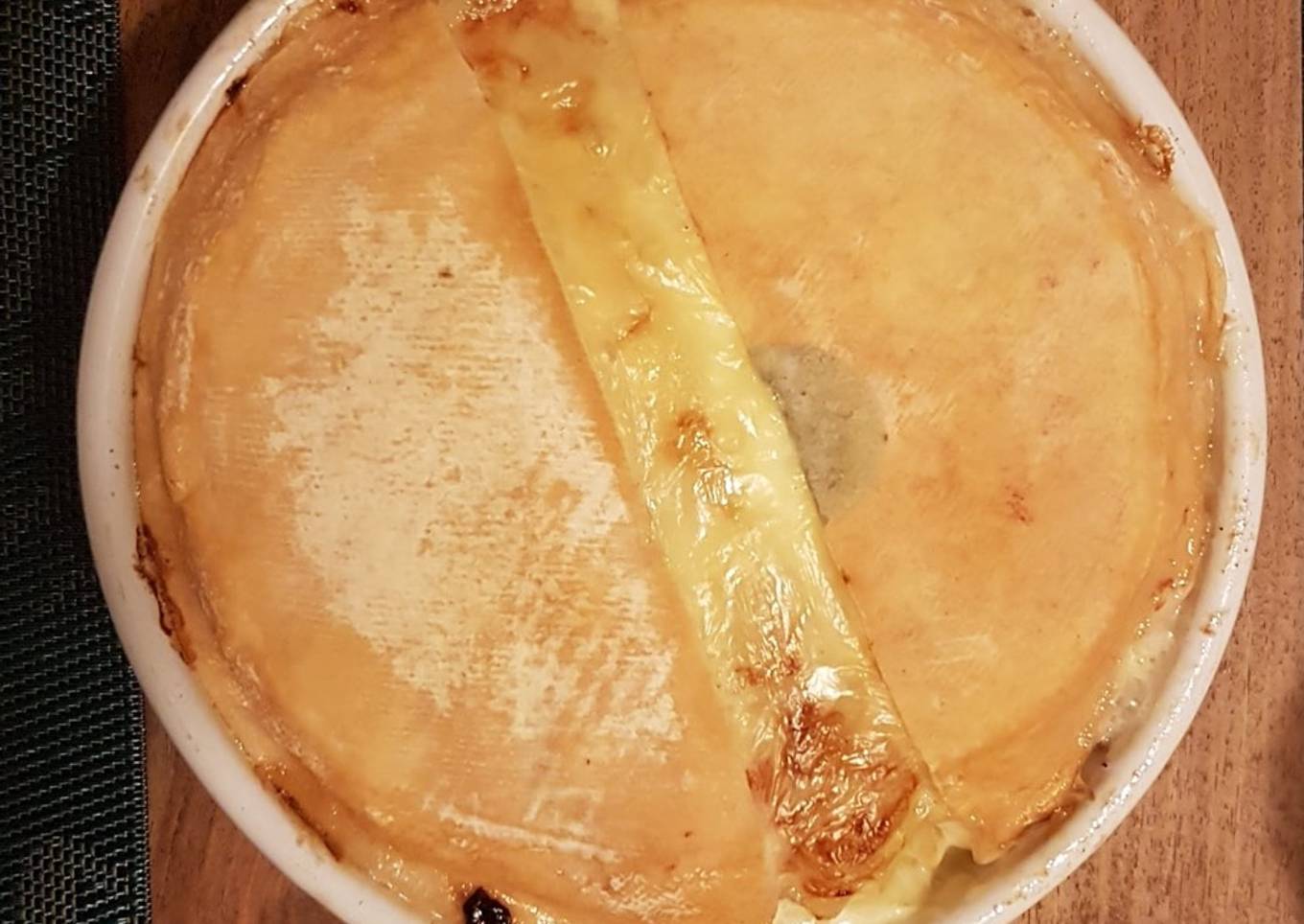 - Couper en 2 dans l’épaisseur de le reblochon et poser chaque morceau dans le plat, croûte vers le haut.